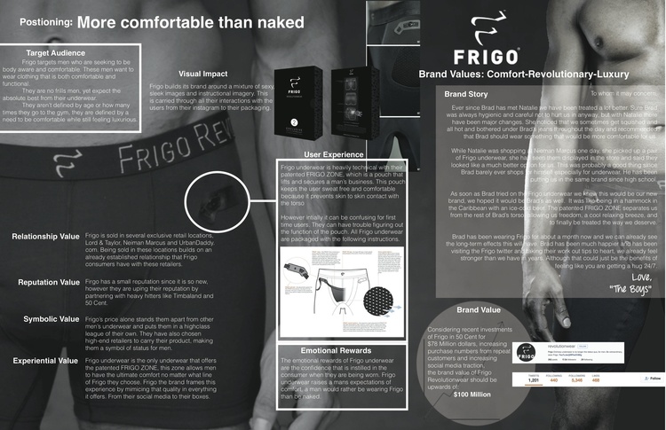 What I Found: After doing a lot of secondary research on the brand I was able to surmise Frigo's over all brand. The main finding was the Frigo wanted to make wearing underwear even better than being naked, that the support and comfort they offered was unparalleled. They want to revolutionize naked.